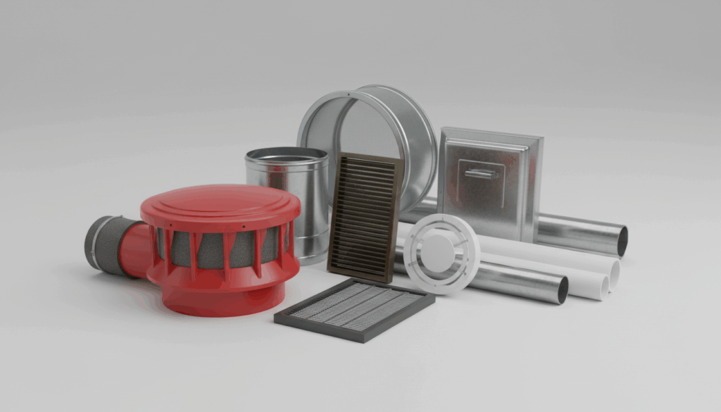 Aftræk og gennemføringer dækker afslutningsdele til ventilationskanaler og taggennemføringer. Kategorien rummer gennemføringer til vægge og lofter, taghætter, undertagsventiler samt inspektionslemme og rammer, der sikrer tætte og pålidelige forbindelser.