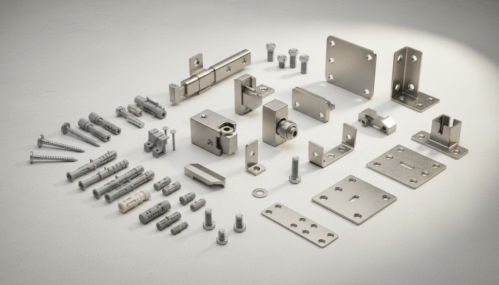 Typiske anvendelser inkluderer møbelmontage, gardinophæng, hyldemontering og køkken- og garderobeinstallationer. Variationerne omfatter hængsler til ind- og udvendig brug, samlebeslag, kophængler, klapbeslag og forskellige skruemidler. Materialer som rustfrit stål (A4), galvaniseret stål og plast giver holdbarhed i mange miljøer.
