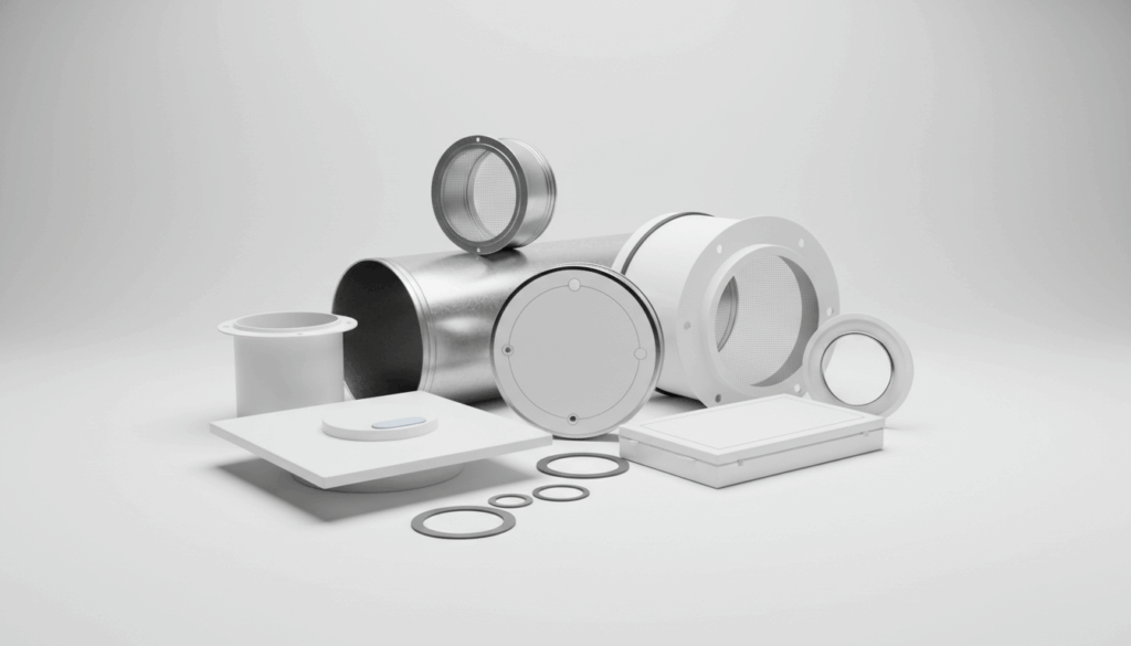 Typiske modeller omfatter Lindab inspektionslem IPLR 160, som kommer med en praktisk skabelon til udskæring, og Dukadan IMM i metal med magnet, 200x200 mm, til hurtig og hygiejnisk adgang i våde områder. Endebund ESNU 63 mm med net beskytter mod støv og insekter ved endestykker, mens gennemføringsstykker som VLG til vægge og lofter sikrer tætte afslutninger.