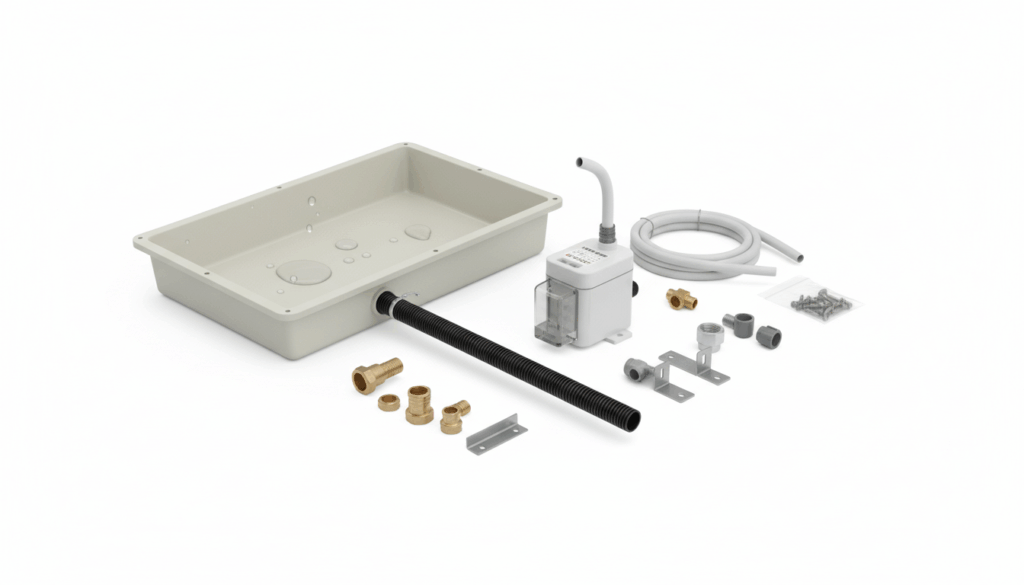 Kondens- og afløbstilbehør omfatter produkter til håndtering af kondensvand fra varmepumper, klimaanlæg og lignende enheder. Kategorien indeholder kondensbakker til opsamling og afledning samt kompakte kondensvandpumper, der flytter vandet videre til afløbet. Eksempler som Kondens Afløbs Bakke (790x355 mm, RAL9002) og Kondensvandpumpe Mini viser to typiske løsninger med holdbar konstruktion og nem installation.