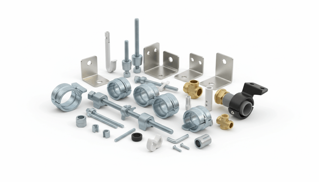 Montage- og ophængsdele til rør dækker alt til fastgørelse, afstivning og støtte af VVS- og varmerør.
