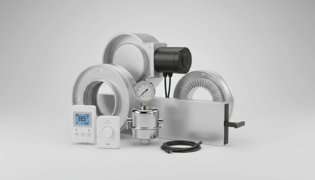 Styring og regulatorer dækker løsninger, der styrer luftstrøm, temperatur og tryk i HVAC-, ventilations- og VVS-installationer. Kategorien omfatter trykluftregulatorer med manometer, motorstyrede spjæld, termostater og hygrostater samt reguleringselementer til styring af varme og ventilation. Der findes både on/off og modulære motorer, 230V og 24V løsninger samt forskellige monteringsformer og effektivitetsanpassninger.